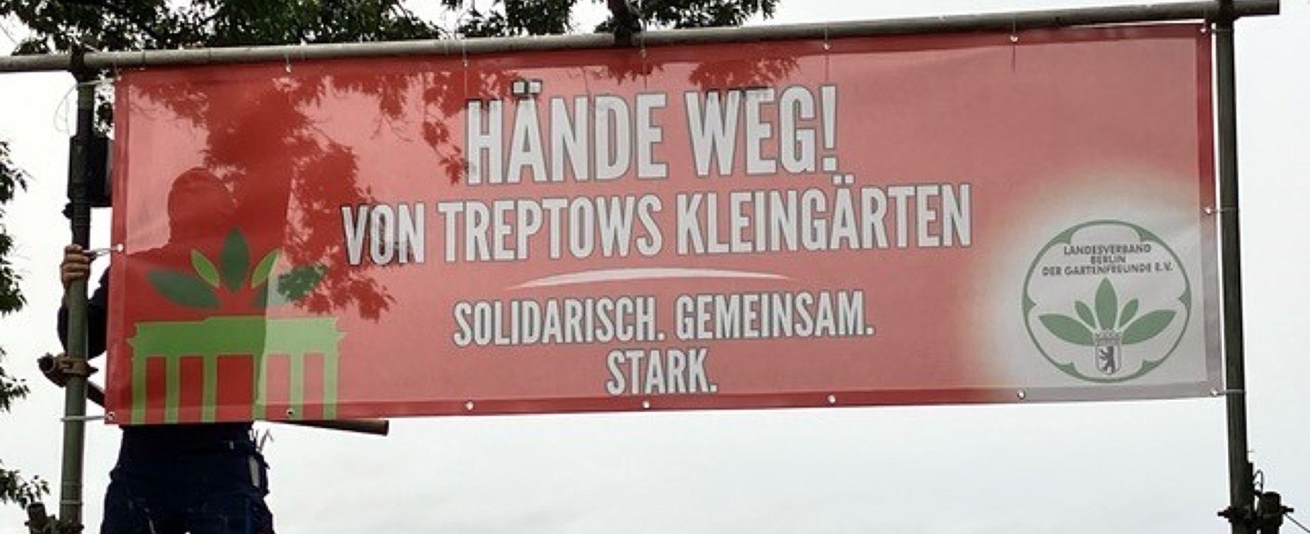 Der Landesverband dankt im Namen der betroffenen Gartenfreunde in Treptow-Späthsfelde allen Banner-Akteuren für die öffentlich gezeigte Solidarität ihres Vereins: Tausend Dank in die Bezirke! Leserinnen und Leser seien sich gewiss: es hängen mehr rote Banner in Berlin, als wir hier zeigen können.